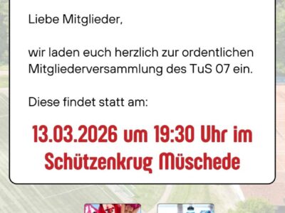 Liebe Eulen, hiermit möchten wir Euch zur regulären Mitgliederversammlung 2025 des TuS Müschede 07 e.V. am Freitag, 07.03.2025, 19.30 Uhr, in den... Weiterlesen