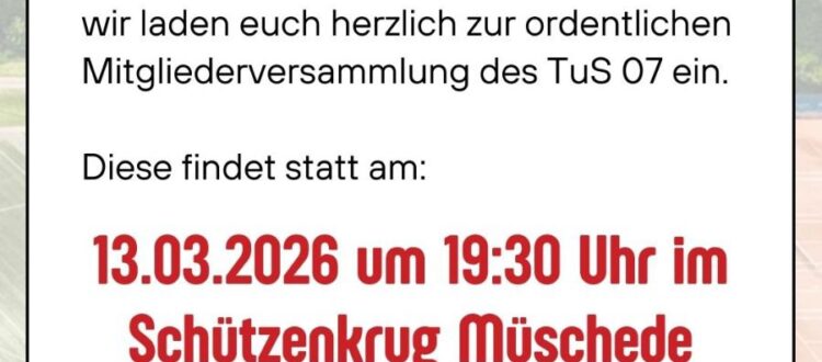 hiermit möchten wir Euch zur regulären Mitgliederversammlung 2025 des TuS Müschede 07 e.V. am Freitag, 13.03.2026, 19.30 Uhr, in den „Schützenkrug“ einladen. Neben Vorstands- und Abteilungsberichten erwarten Euch wieder zahlreiche Ehrungen langjähriger und verdienter Mitglieder sowie Vorstandswahlen. Ebenso werden wir ausführlich zum Stand bei der Instandsetzung der durchs Hochwasser beschädigten Sport-Arena berichten. Im Anschluss kann in der geöffneten Ehrenamtskneipe wieder weiter diskutiert werden. Wir freuen uns auf zahlreiche Teilnehmende.
