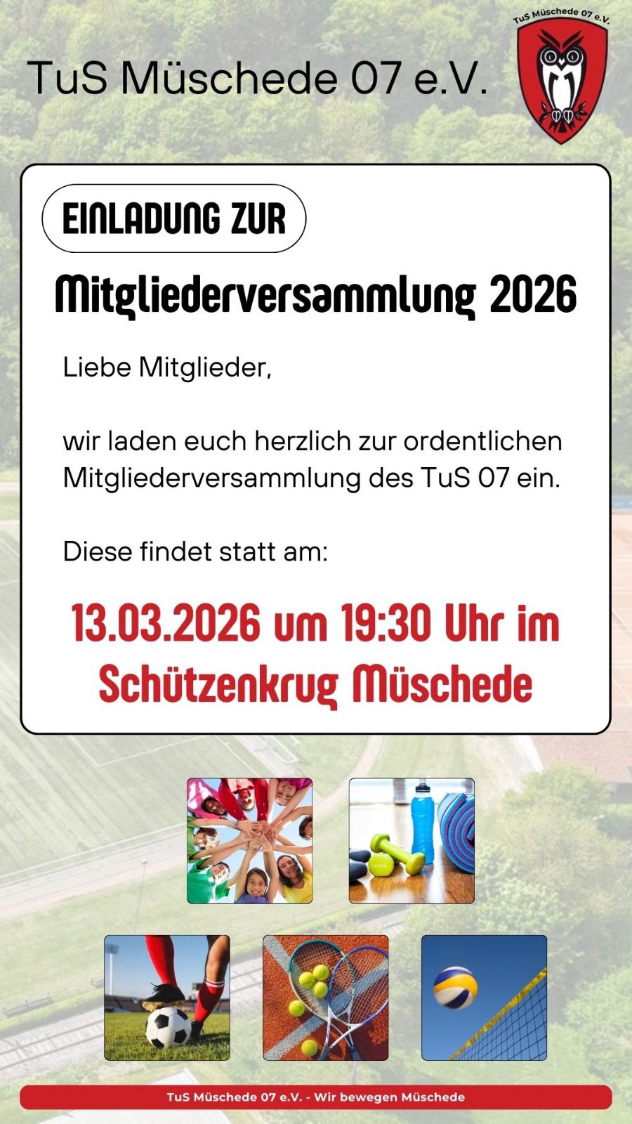 hiermit möchten wir Euch zur regulären Mitgliederversammlung 2025 des TuS Müschede 07 e.V. am Freitag, 13.03.2026, 19.30 Uhr, in den „Schützenkrug“ einladen. Neben Vorstands- und Abteilungsberichten erwarten Euch wieder zahlreiche Ehrungen langjähriger und verdienter Mitglieder sowie Vorstandswahlen. Ebenso werden wir ausführlich zum Stand bei der Instandsetzung der durchs Hochwasser beschädigten Sport-Arena berichten. Im Anschluss kann in der geöffneten Ehrenamtskneipe wieder weiter diskutiert werden. Wir freuen uns auf zahlreiche Teilnehmende.